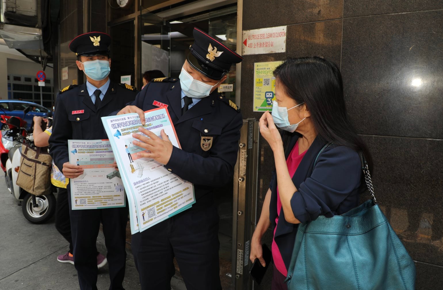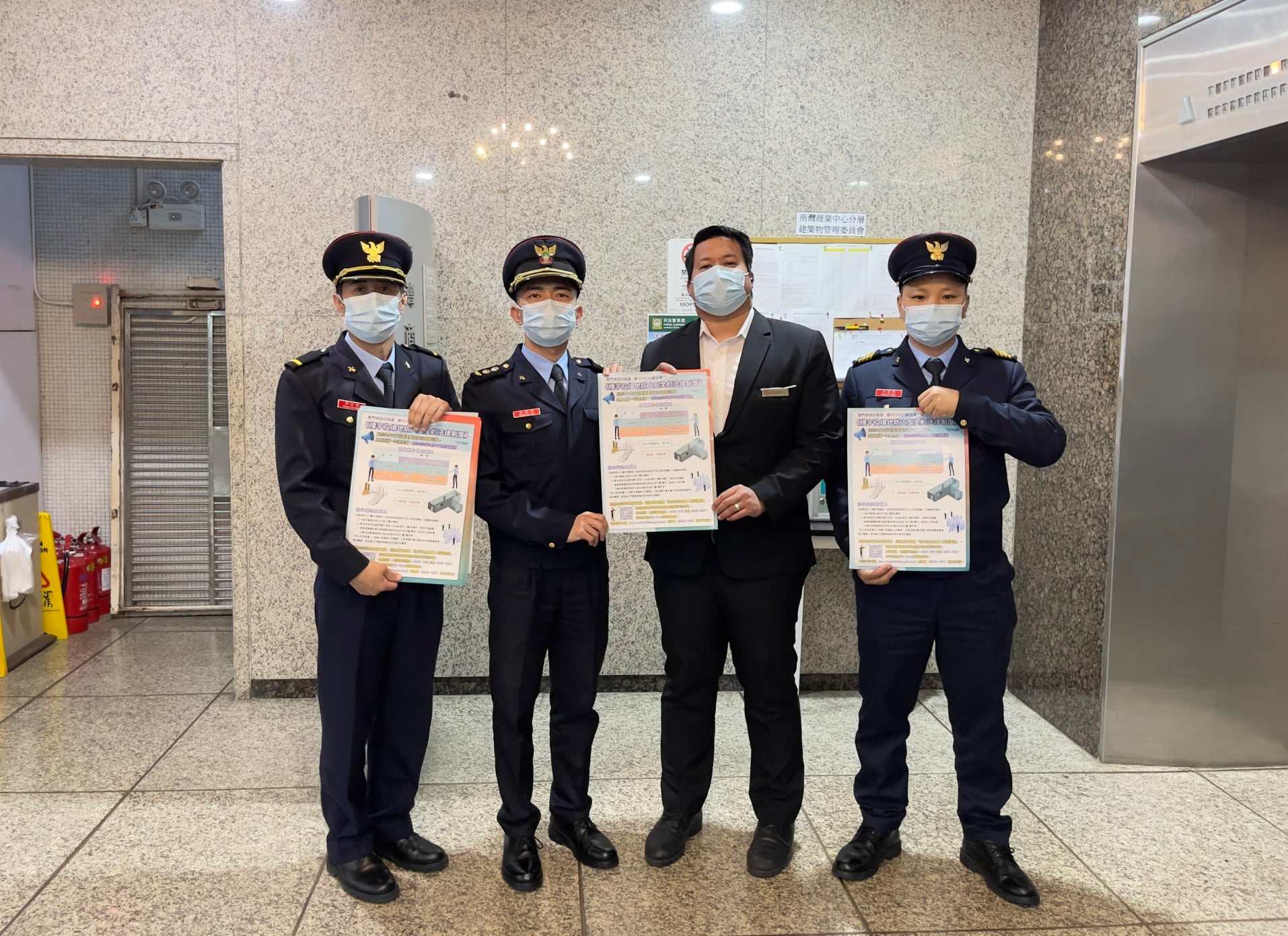 消防局持續派員到本澳各區進行新防火法的宣傳推廣工作,於4月6日及7日前往南灣及下環街一帶,走進區內商廈及屋苑入戶宣傳,並張貼宣傳海報,呼籲物業管理從業員及居民關注新防火法內容。