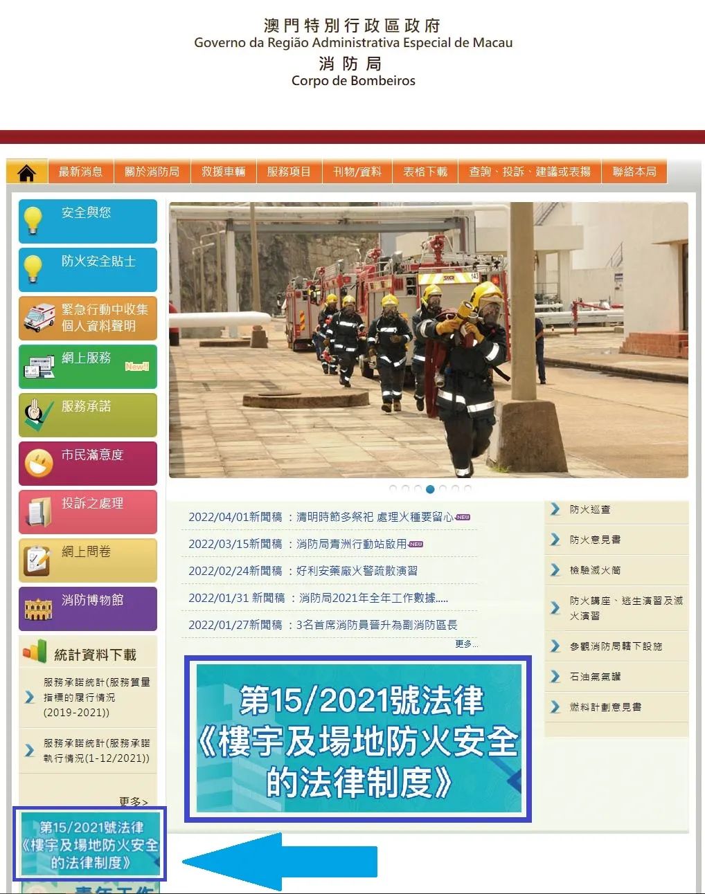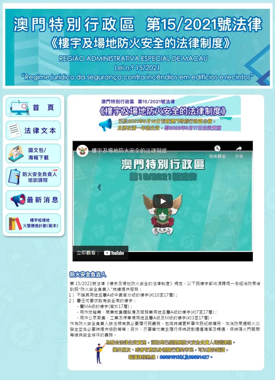 為了令社會各界能更清晰了解第15/2021號法律《樓宇及場地防火安全的法律制度》的相關内容,消防局已於官網內增設新防火法律專頁,方便市民大眾瀏覽。