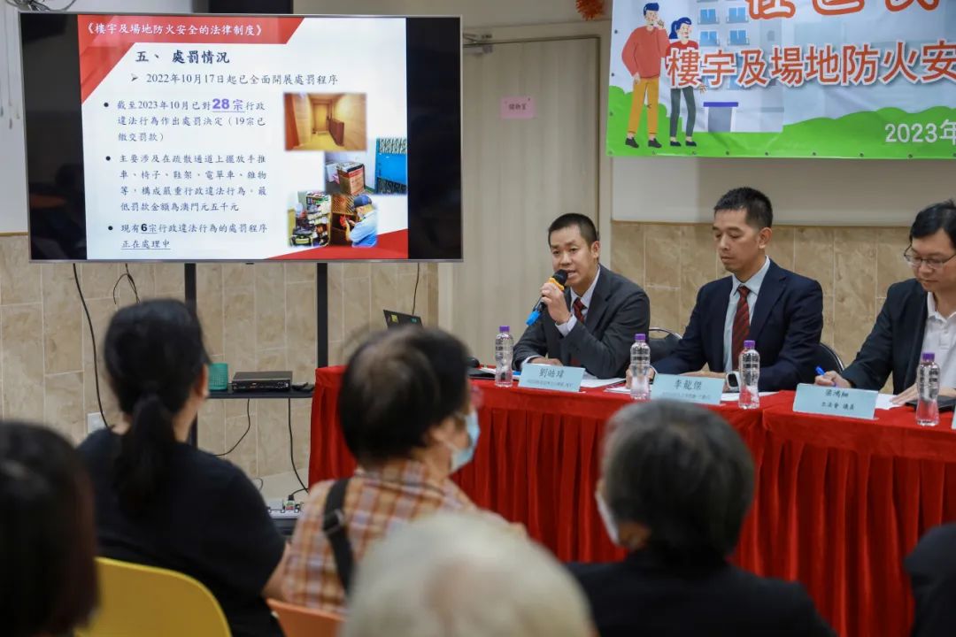 座談會上,由消防局教育宣傳及公關處處長劉皓瑋介紹《樓宇及場地防火安全的法律制度》實施至今的相關執行成效、宣傳工作、配備防火安全負責人等情況,他表示,自2022年8月13日起進行防火安全巡查及宣傳,截至2023年10月,消防局合共進行逾46,000次防火安全大排查及巡查等工作。當中發現部分市民存有違規行為,有關情況包括:至2023年10月完成行政處罰程序共有28宗(19宗已主動繳交罰款),主要涉及在疏散通道上擺放手推車、椅子、鞋架、雜物等,構成嚴重行政違法行為。最低罰款金額為澳門元五千元;而行政違法行為的處罰程序正在處理中共有6宗。