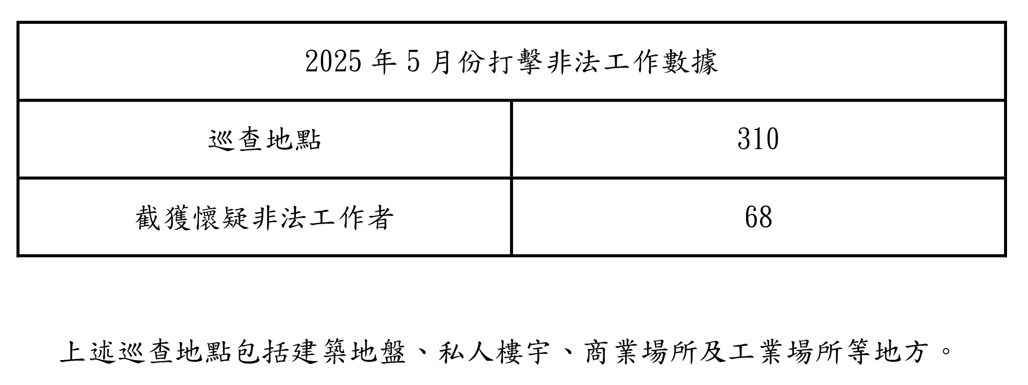 治安警察局 Corpo de Polícia de Segurança Pública 本局動態 > 最新消息 2025/6/17 新聞稿:打擊非法工作行動2025年5月份統計資料 2025年5月份,治安警察局、勞工事務局以及各聯合行動中,打擊非法工作的行動之統計資料如下: