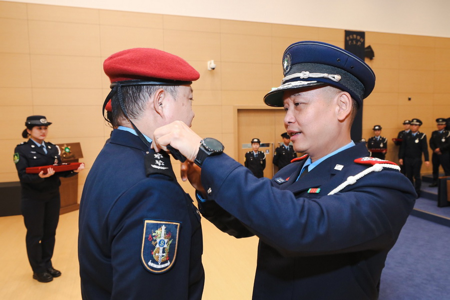 吳錦華局長在儀式中向晉升人員表示祝賀,勉勵他們要嚴明紀律,恪守規矩,以全局思維執行工作,同時須銘記保安司司長的鄭重叮囑,務必深刻領會“慎獨、慎微、慎初”的真義並內化於心,築牢“不敢腐、不能腐、不想腐”的思想與制度防線,共同鑄就一支“廉潔高效、專業精幹”的警察隊伍;並寄語他們要牢記初心使命,以忠誠踐行職責,以擔當回應期盼,以法治守護安寧,以服務溫暖民心,在維護國家安全、守護澳門社會穩定、保障市民生命財產安全的道路上,作出更大的貢獻。