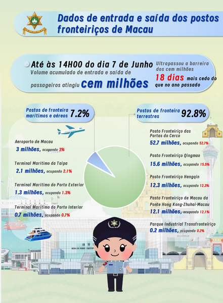 Este ano, 2025, sob o impulso das políticas favoráveis a Macau como “uma entrada por semana”, “um visto de múltiplas entradas” e “Circulação de veículos de Macau na província de Guangdong”, o número de entradas e saídas de pessoas nos diversos postos fronteiriços de Macau mantem-se num nível elevado, tendo sido batido, repetidamente, novos recordes do volume de passageiros. Até às 14H00 do dia 7 de Junho de 2025, o número total de entradas e saídas de Macau do corrente ano ultrapassou cem milhões, o que ocorreu 18 dias mais cedo do que no ano passado, tendo sido batido mais uma vez novo recorde de tempo mais curto a atingir as cem milhões de passagens fronteiriças, com uma média diária de 0.6 milhões entradas e saídas de Macau, representando um aumento de 10.8% em relação ao mesmo período do ano passado. Além disso, o volume de passageiros/passagens no Posto Fronteiriço das Portas do Cerco ultrapassou 50 milhões no dia 30 de Maio, tendo o Posto Fronteiriço Hengqin e o Posto Fronteiriço de Macau da Ponte Hong Kong-Zhuhai-Macau atingido o fluxo anual de 10 milhões passagens fronteiriças, sucessivamente em 7 e 9 de Maio, mais cedo que o ano anterior.