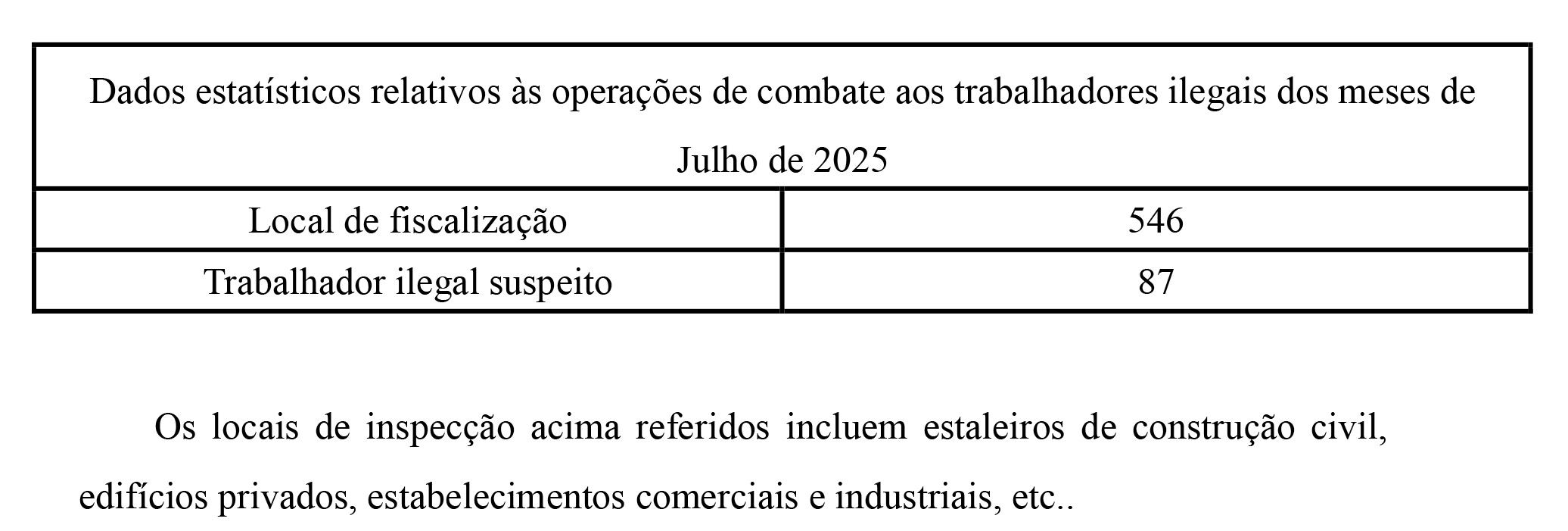 18/8/2025 Comunicado:Dados estatísticos relativos às operações de combate aos trabalhadores ilegais dos meses de Julho de 2025
