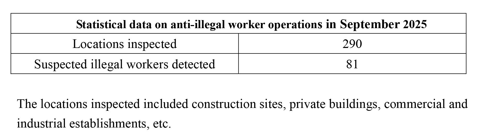 Concerning the Public Security Police Force’s operations and the Labour Affairs Bureau’s operations as well as various joint operations against illegal workers in September 2025, the figures are set out below: