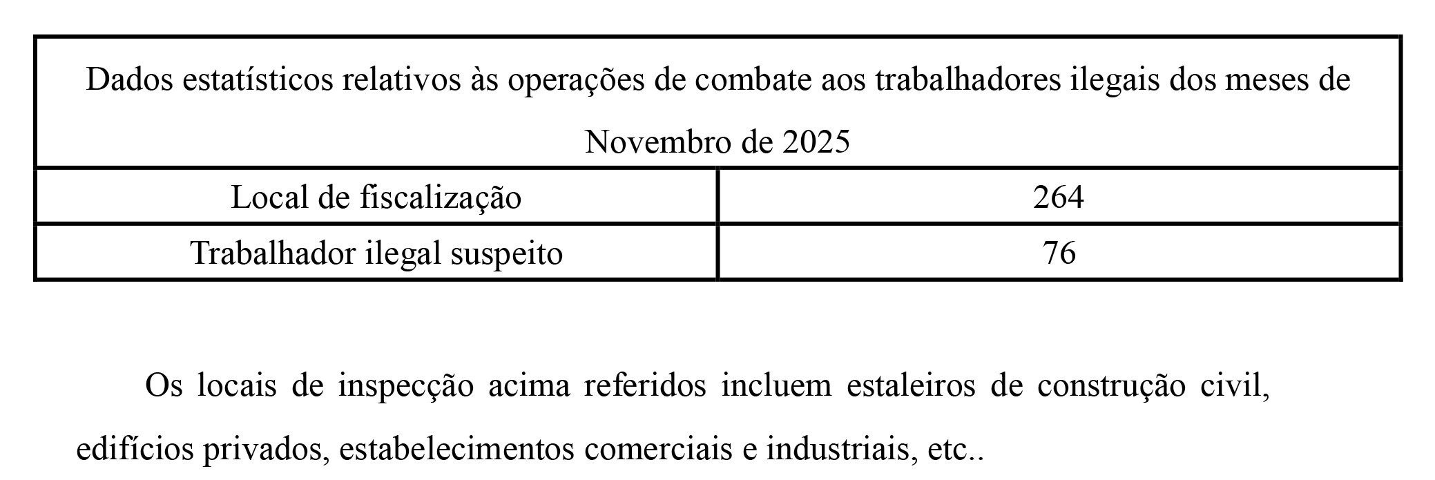 Os dados estatísticos relativos ao combate de trabalhadores ilegais dos meses de Novembro de 2025, nas operações desenvolvidas individualmente, pelo CPSP e pela DSAL, e em conjunto, entre o CPSP e a DSAL, e, entre o CPSP e outros serviços, são os seguintes: