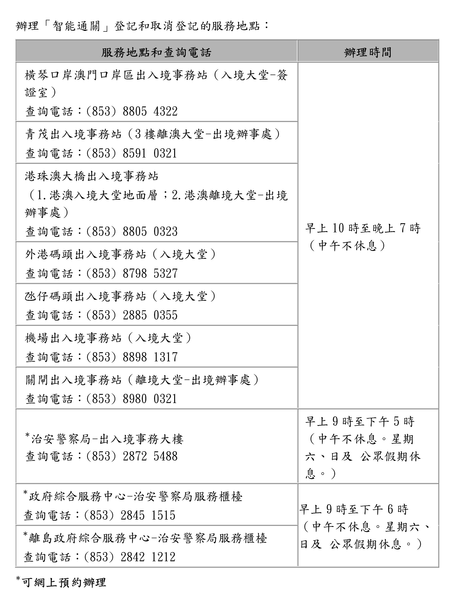 已登記人士如需要取消登記,可親臨治安警察局指定服務點(包括橫琴口岸,詳見下表)辦理有關手續;未成年人則須由父、母或監護人陪同辦理,並須出示未成年人的通關證件及相關親屬關係證明文件。