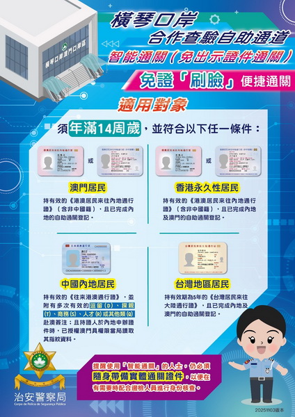 習近平主席去年底在視察澳門及橫琴粵澳深度合作區時强調要:“發揮先行先試的作用”,“把琴澳一體化提升到更高水平”。為貫徹落實有關重要指示精神,治安警察局、澳門保安部隊事務局、珠海出入境邊防檢查總站及橫琴粵澳深度合作區經濟發展局共同完成了橫琴口岸旅檢大廳48條及隨車人員驗放廳16條「合作查驗自助通道」的軟硬件升級工作,並將於2025年11月5日在該口岸推出「智能通關」(免出示證件通關)措施,實現「刷臉」代替「刷證」便捷通關。