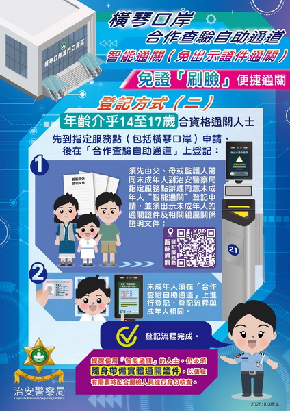 為保障未成年人跨境出行安全,年齡介乎14至17歲之未成年人,倘有意使用橫琴口岸「智能通關」措施,須先由父、母或監護人帶同未成年人到治安警察局指定服務點(包括橫琴口岸,詳見下表)辦理同意未成年人「智能通關」登記申請,並須出示未成年人的通關證件及相關親屬關係證明文件。