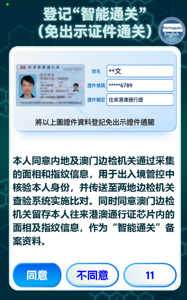 完成上述申請後,未成年人須與成年人登記流程一樣,在橫琴口岸澳門往橫琴或橫琴往澳門方向使用「合作查驗自助通道」時,在第一閘門交驗通關證件,閱讀聲明並點選「同意」按鈕後,即可完成整個登記流程。